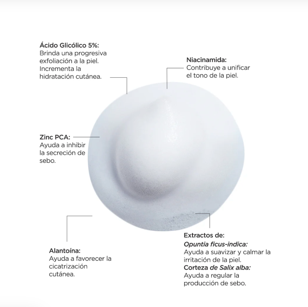 • Ácido Glicólico 5%: Brinda una progresiva exfoliación a la piel. Incrementa la hidratación cutánea. • Niacinamida: Contribuye a unificar el tono de la piel. • Alantoína: Ayuda a favorecer la cicatrización cutánea. • Extracto de Opuntia ficus-indica: Ayuda a suavizar y calmar la irritación de la piel. • Extracto de Corteza de salix alba: Ayuda a regular la producción de sebo.